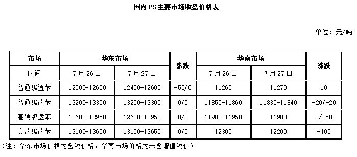 27日,PS市场稳中略软,交投气氛平淡。华东市场以稳为主,贸易商周末情结较重,无心操盘,多采取轻仓观望政策。成本持续动力略显不足,且下游需求难振,贸易商出货压力较大,致使华南市场部分报盘窄幅阴跌。华东市场普通透苯报12450-12600元/吨,改苯报13200-13300元/吨。