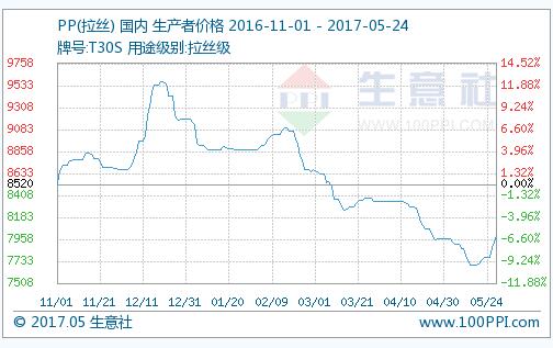 今日国内PP市场价格由涨转跌。5月23日PP(拉丝)商品指数为63.94,较周期内最高点100.67点(2011-09-19)下降了36.49%,较2016年01月18日最低点49.23点上涨了29.88%。(注:周期指2011-09-01至今)