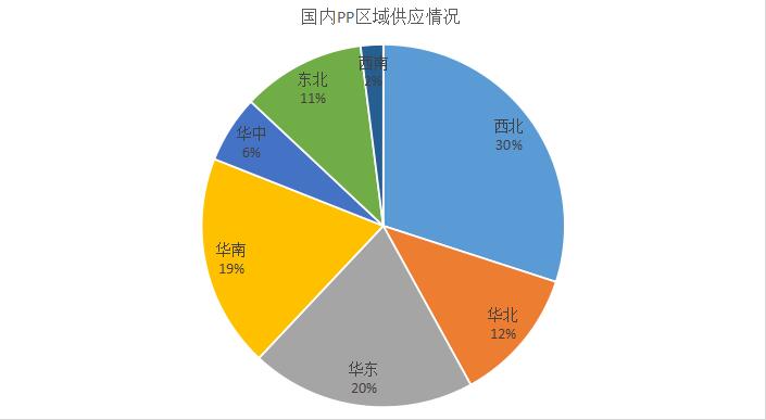 PP供应按照地区供应占持稳:西北地区日产量最高,供应占比为30%;华东地区目前维持第二为20%;华南以19%排名第三;华北地区位居第四,占比位12%,东北地区占比11%,华中占比6%,西南占比2%。